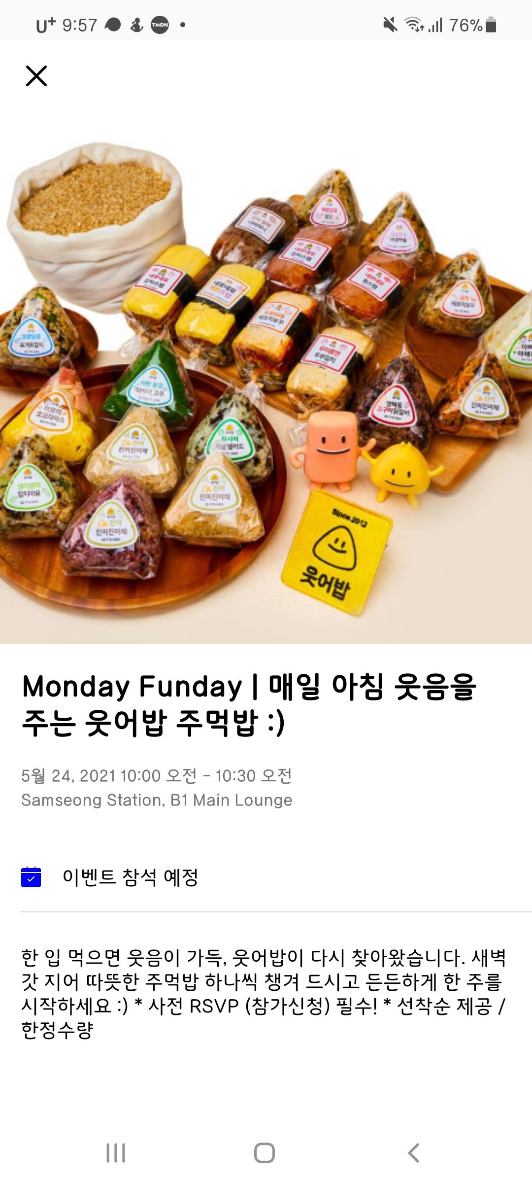 오늘의 위워크삼성점 Monday Funday 매일아침웃음을주는 웃어밥주먹밥입니다.