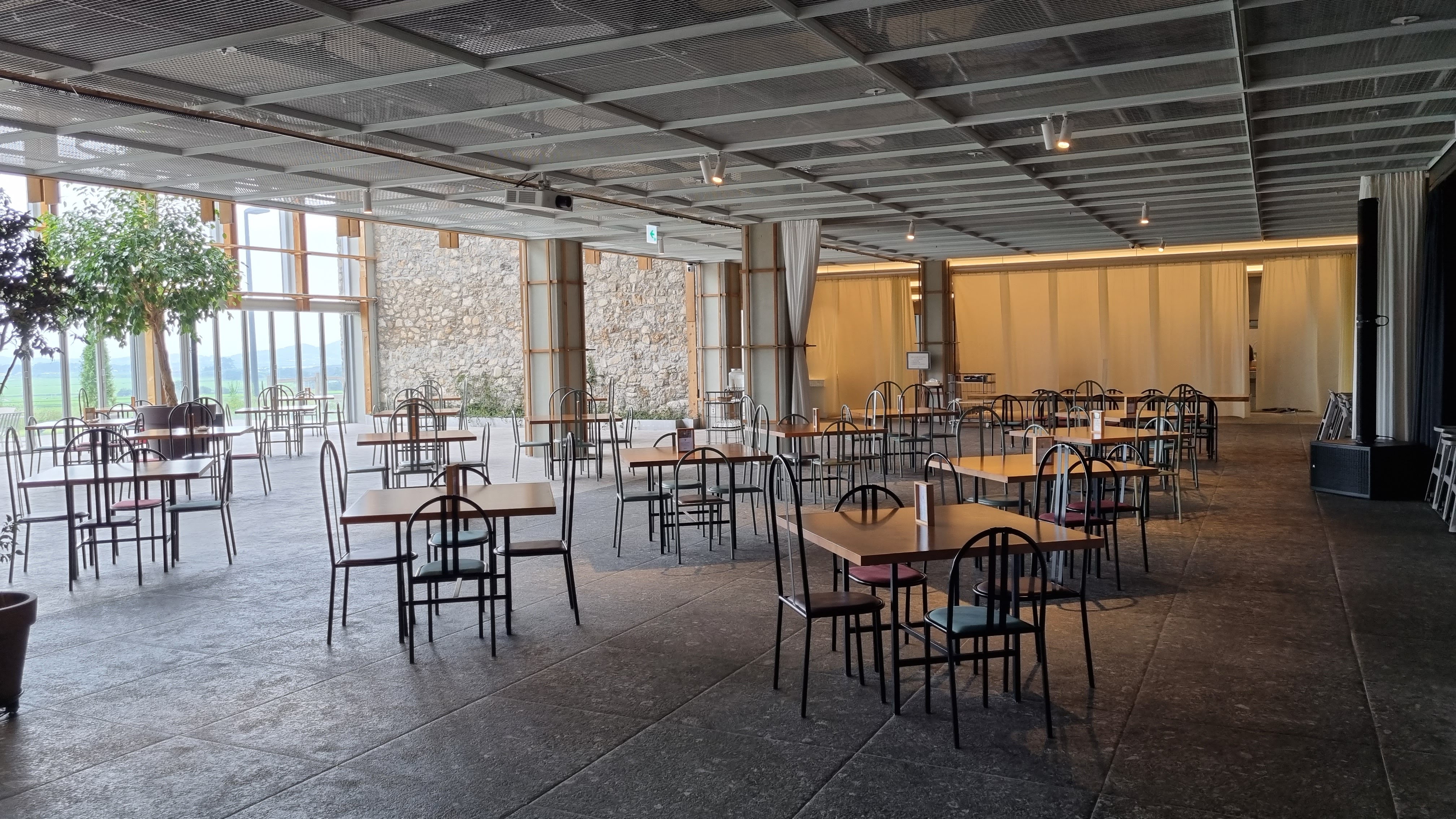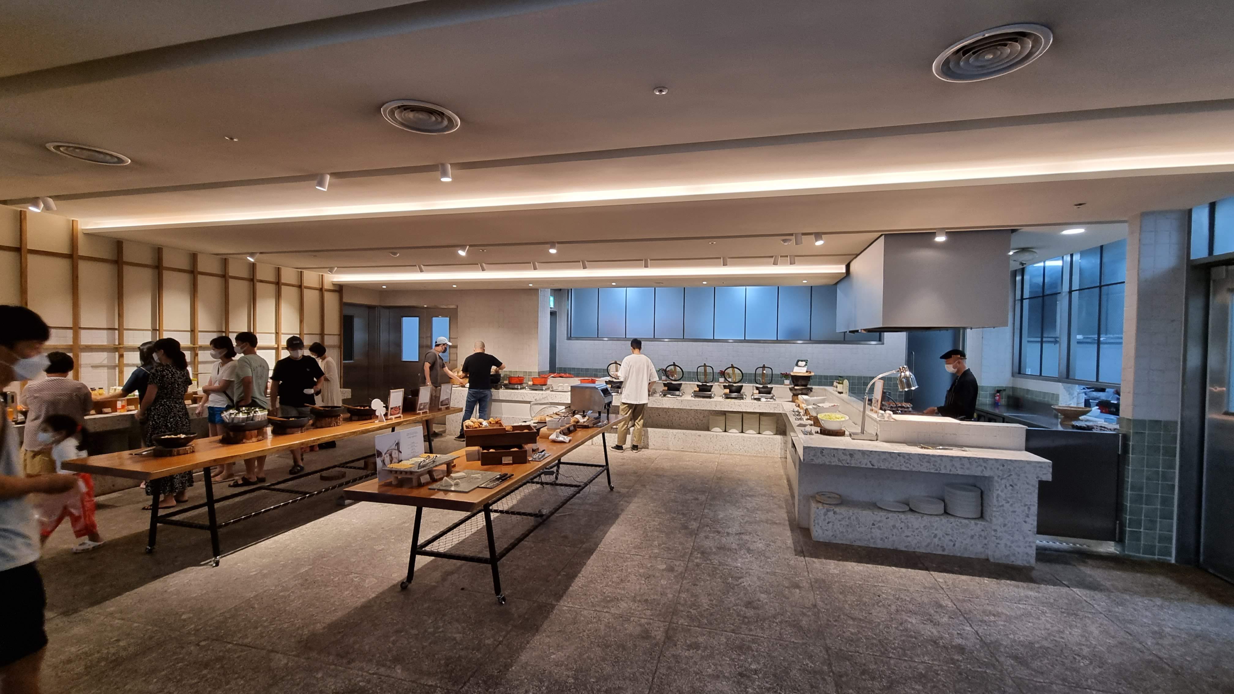 아침시작이 오전 7시 30분부터라서 일찍 내려갔더니 아직 준비중이네요. 저렇게 멀리 보이는 커튼 부분이 음식을 준비하는 공간입니다. 개시가 되면 커튼이 열리면서 뷔페로 가져다 드실 수 있어요.