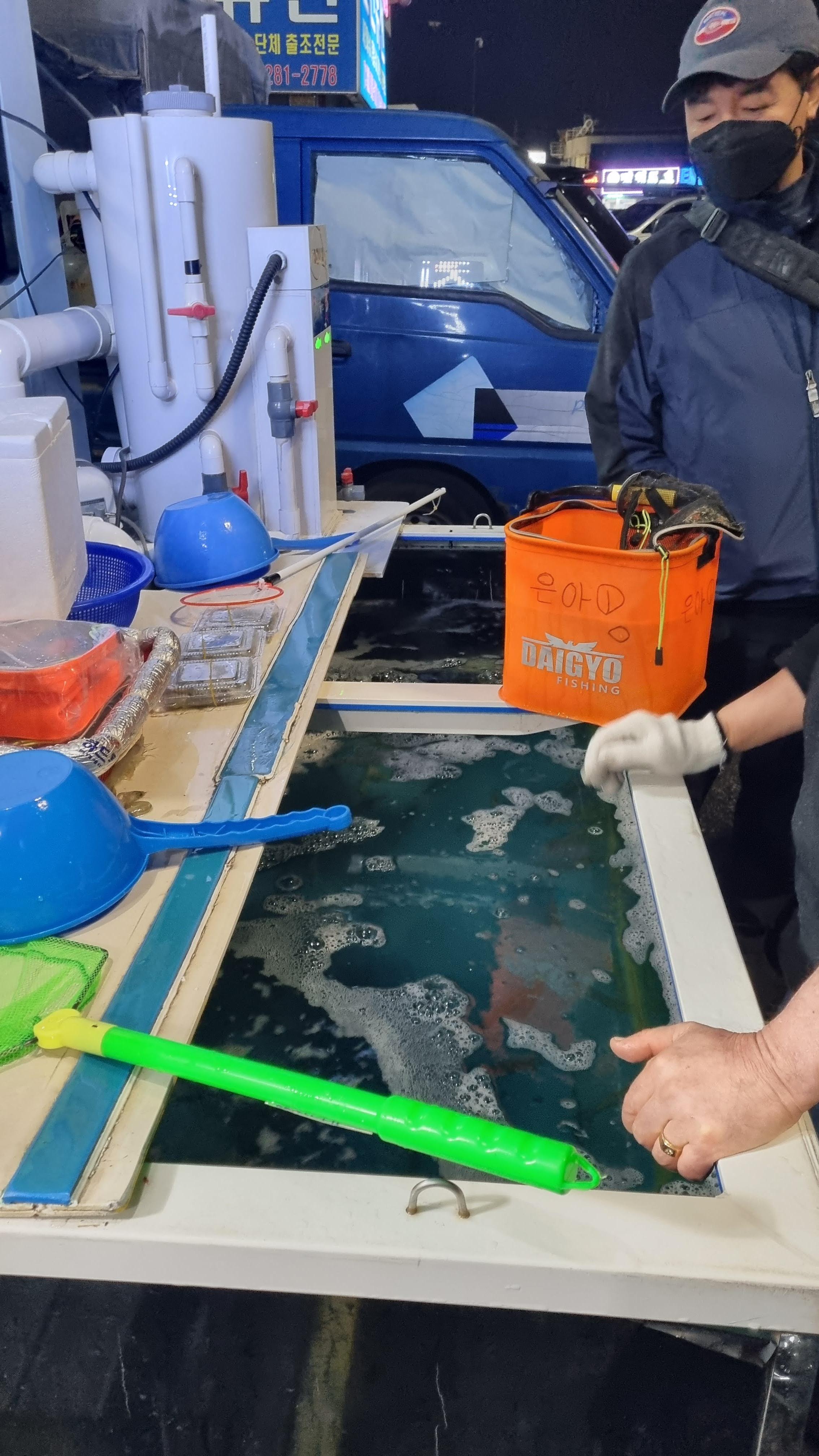 저희 배는 뽈락이나 광어, 민어를 잡는 배였는데 얘네들은 생새우를 가장 좋아해서 이건 꼭 사야한다고 하네요. 2만원어치 구매해서 탑승했습니다. 모든 종류를 다 조금씩 구매는 했는데 끼우기 편한 오징어는 다 썼고 생새우도 많이 사용했습니다. 다른 건 거의 안써서 주변분들 나눠드리고 그랬습니다. 생새우는 신선도 유지에 기포기가 필요한데 그것도 구매를 해야하더라고요. 저희는 그냥 될대로 되라하고 사가진 않았습니다.