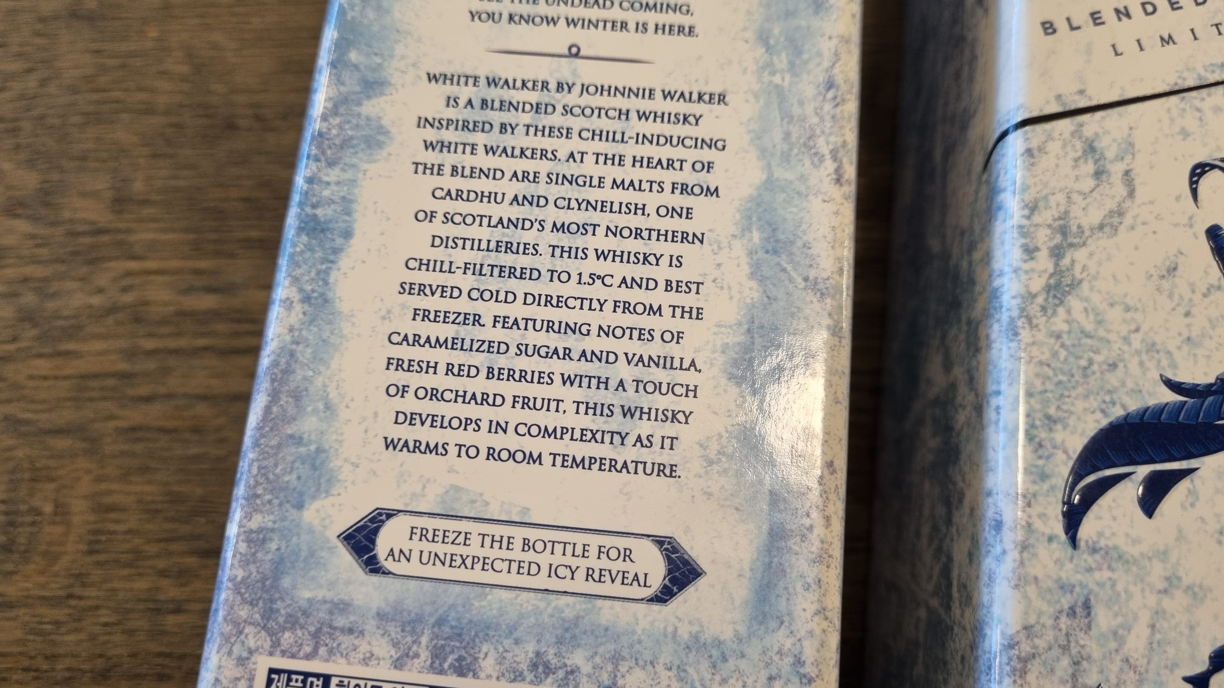 상자 뒤에보면 1.5도시까지 차갑게 해서 마시면 더 맛있는 조니워커 위스키를 즐길 수 있다고 합니다. 그리고 "Freeze the bottle for an unexpected icy reveal." 이라고 써 있죠.
