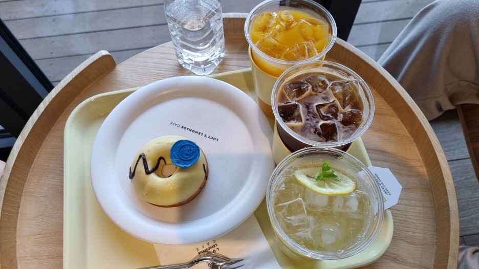 찰리브라운구움도넛과 레몬에이드, 아이스커피랑 감귤쥬스를 주문했습니다.