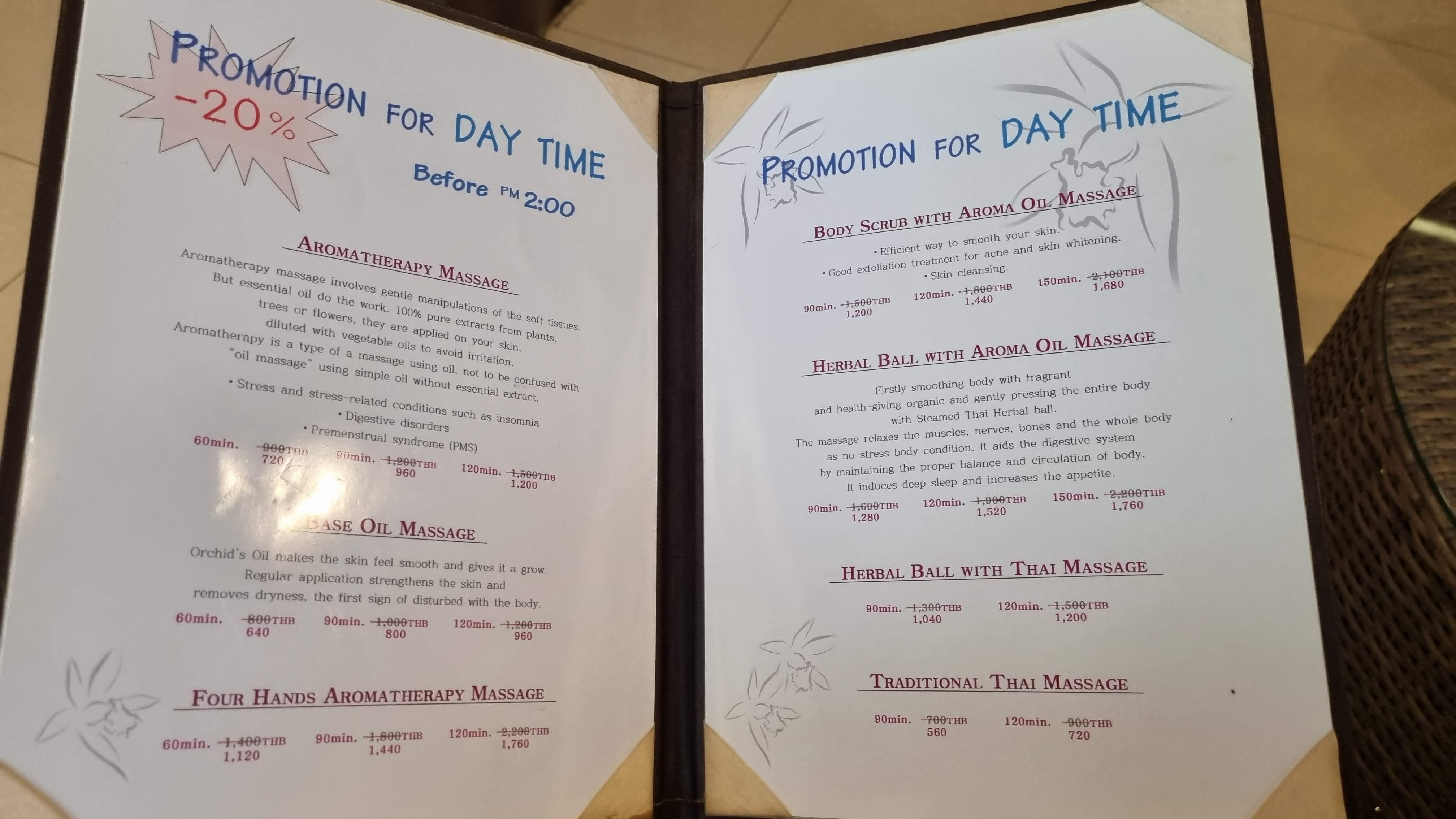 아내는 아로마테라피 마사지 2시간, 저는 90분짜리 정통타이마사지를 선택했습니다.