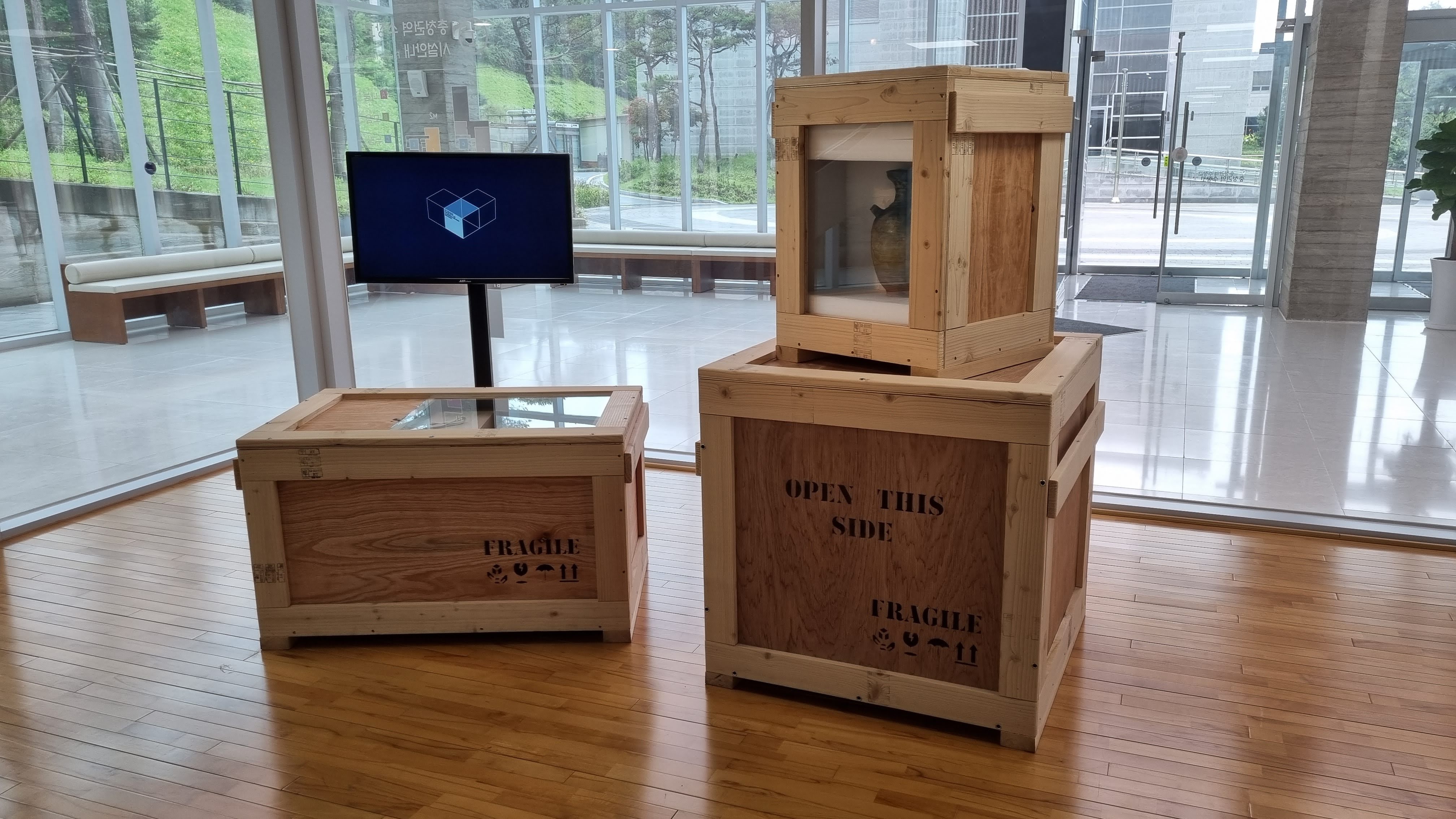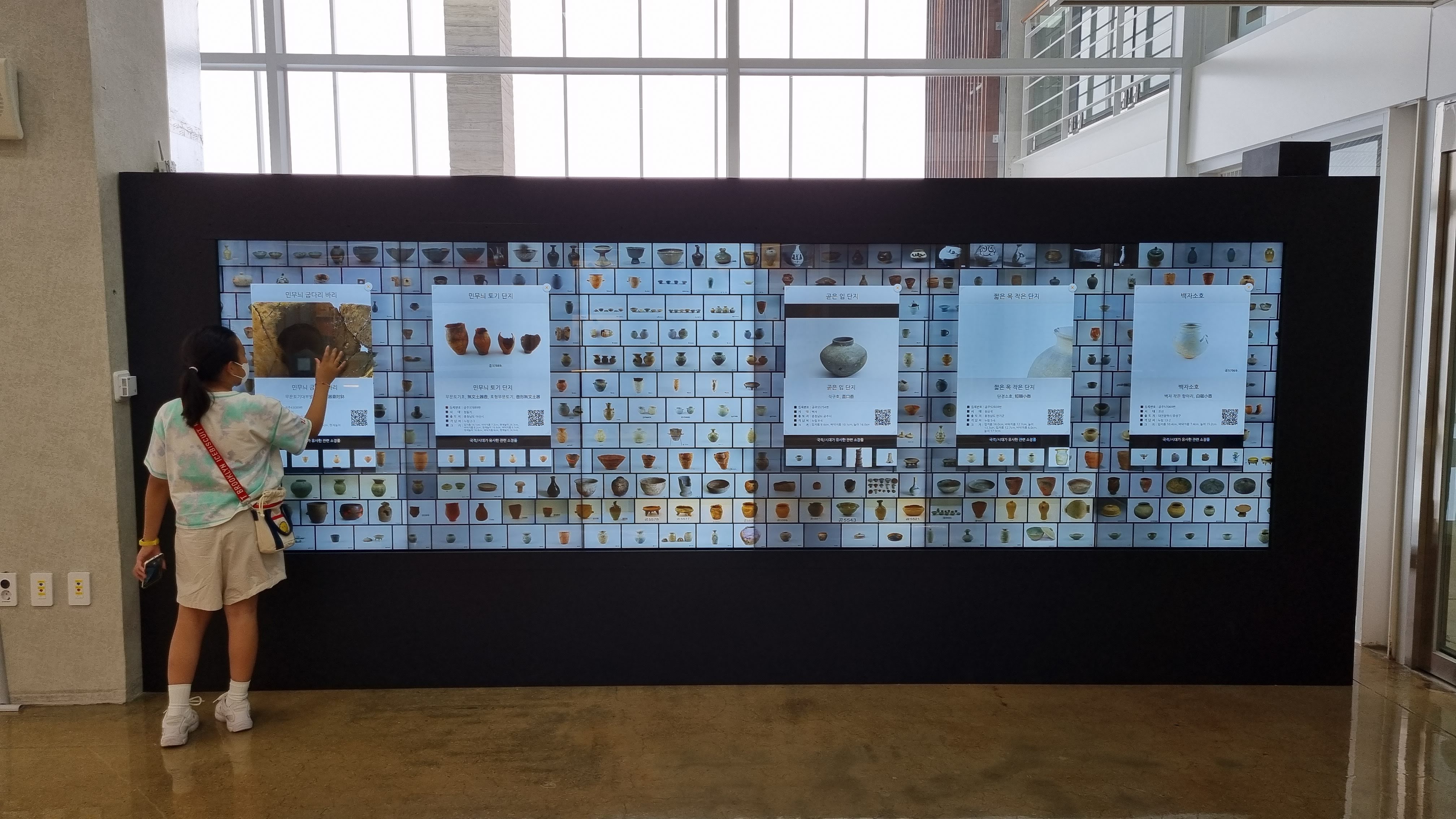어떤 유물들이 있는지 이렇게 멀티터치 스크린으로 찾아볼 수 있습니다. 각 유물들에도 QR코드가 있어서 여기서 매칭도 됩니다.