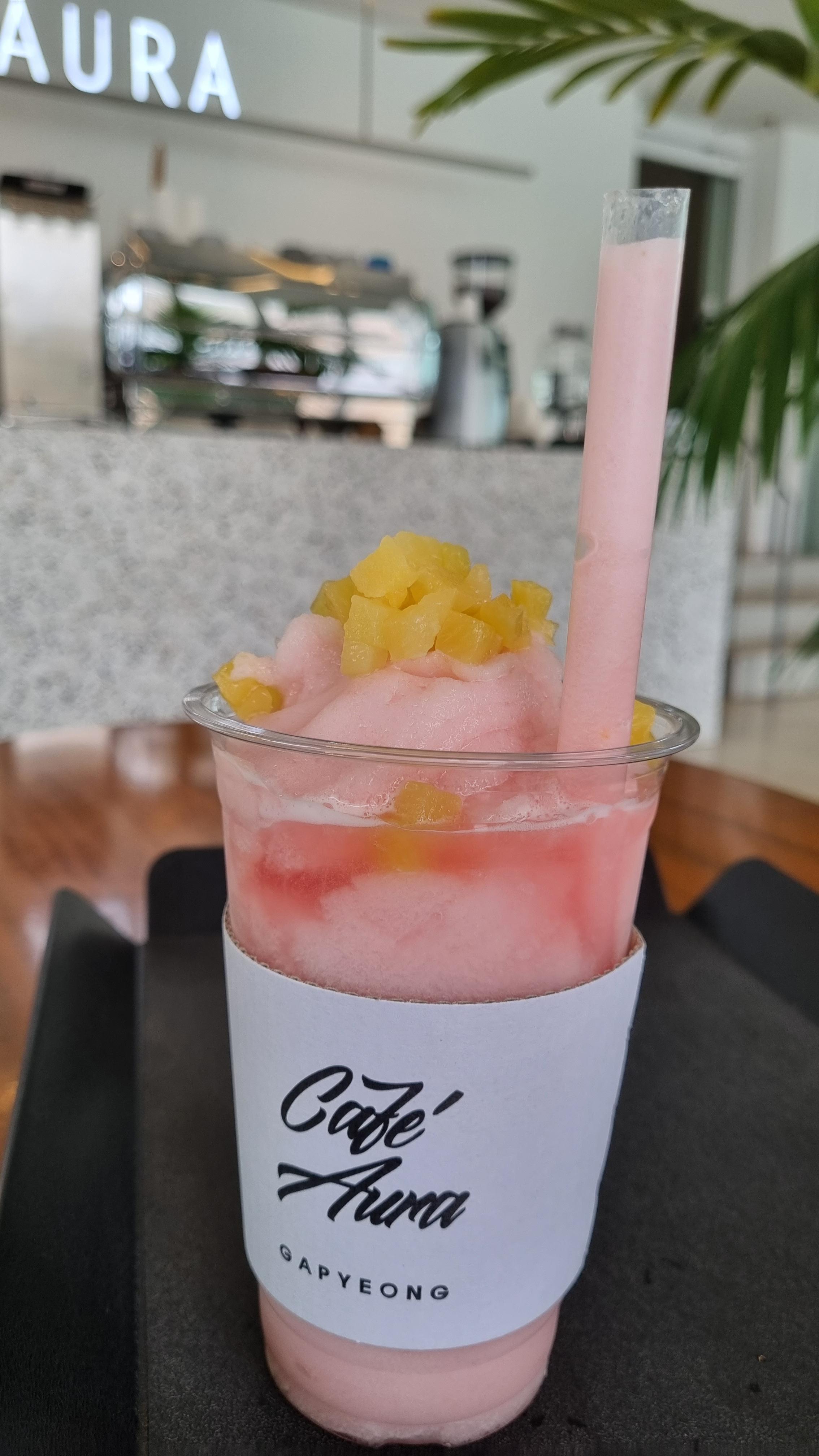 저는 복숭아 스무디 주문했어요. 맛은 쏘쏘. 아는 맛입니다.