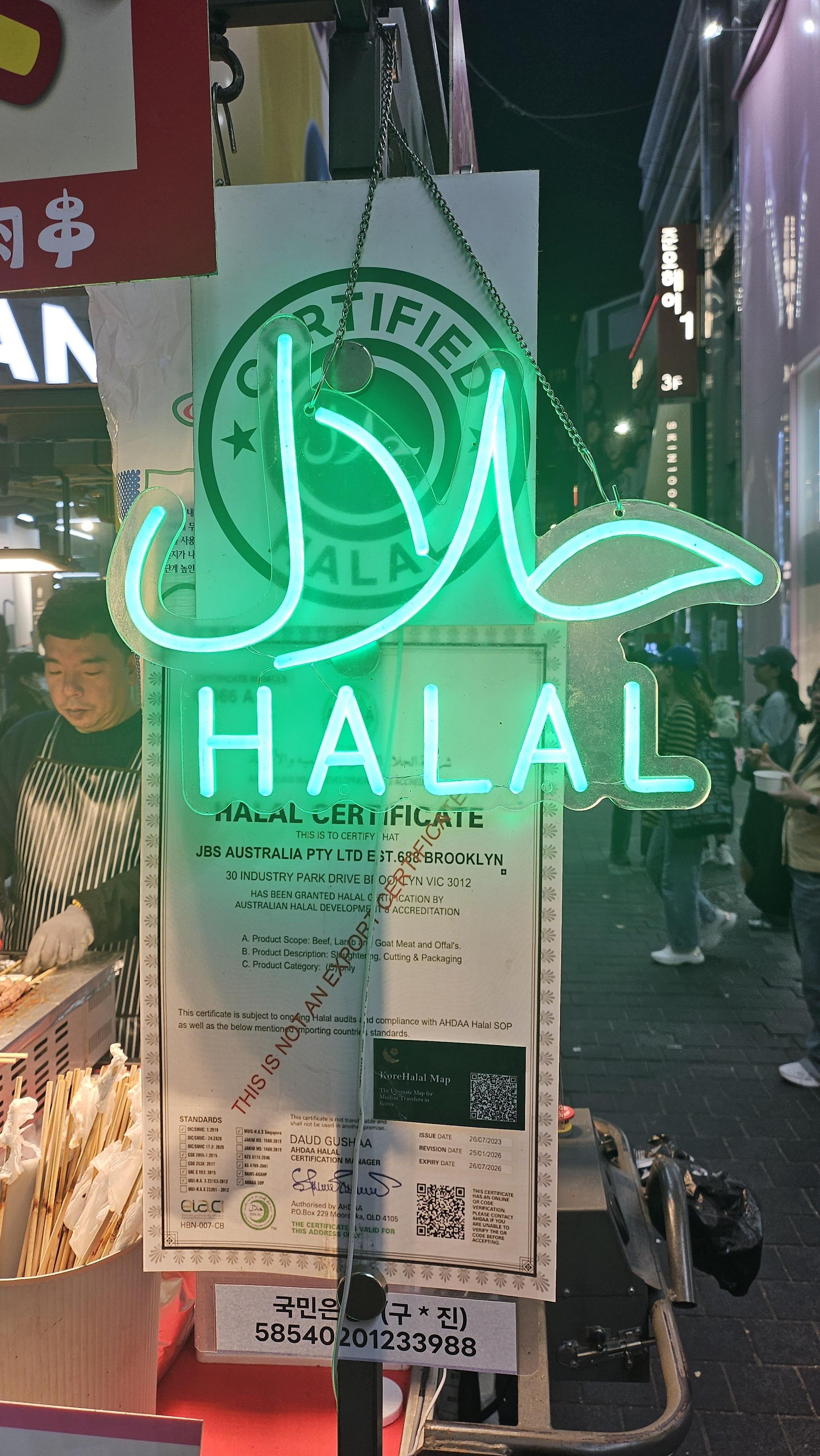 이렇게 네온으로 램스틱 양꼬치를 할랄 인증이 된 걸로 만들었다... 이렇게 표현하고 있습니다.