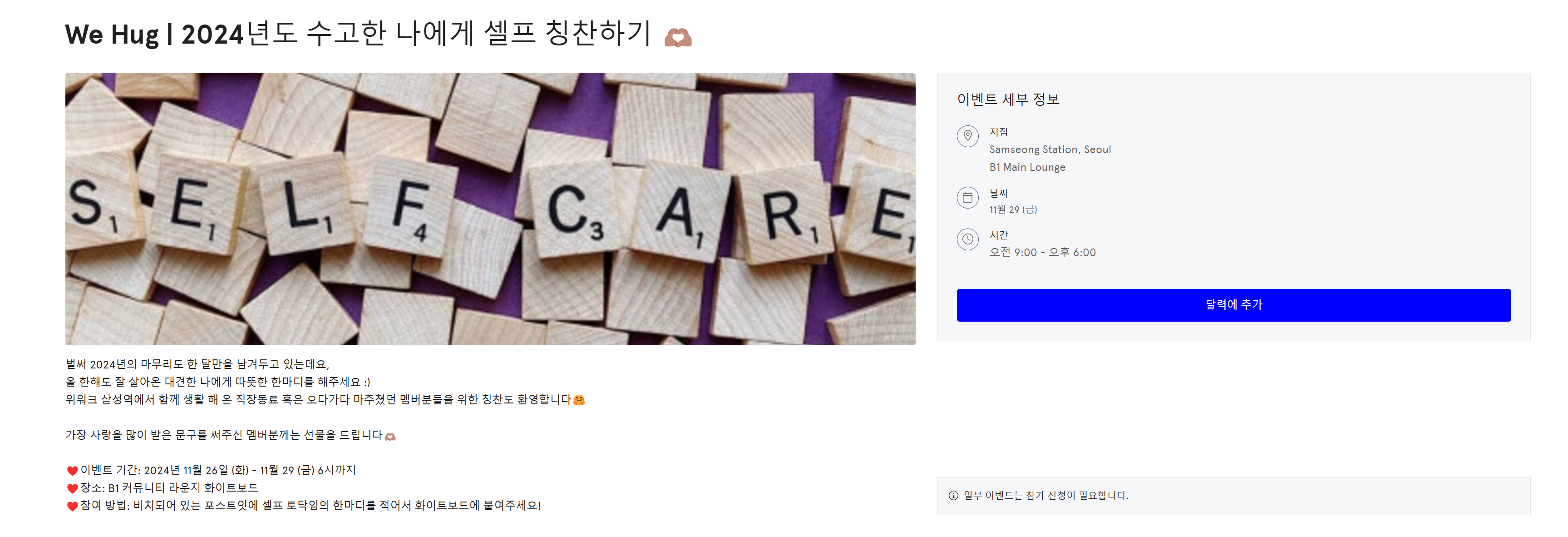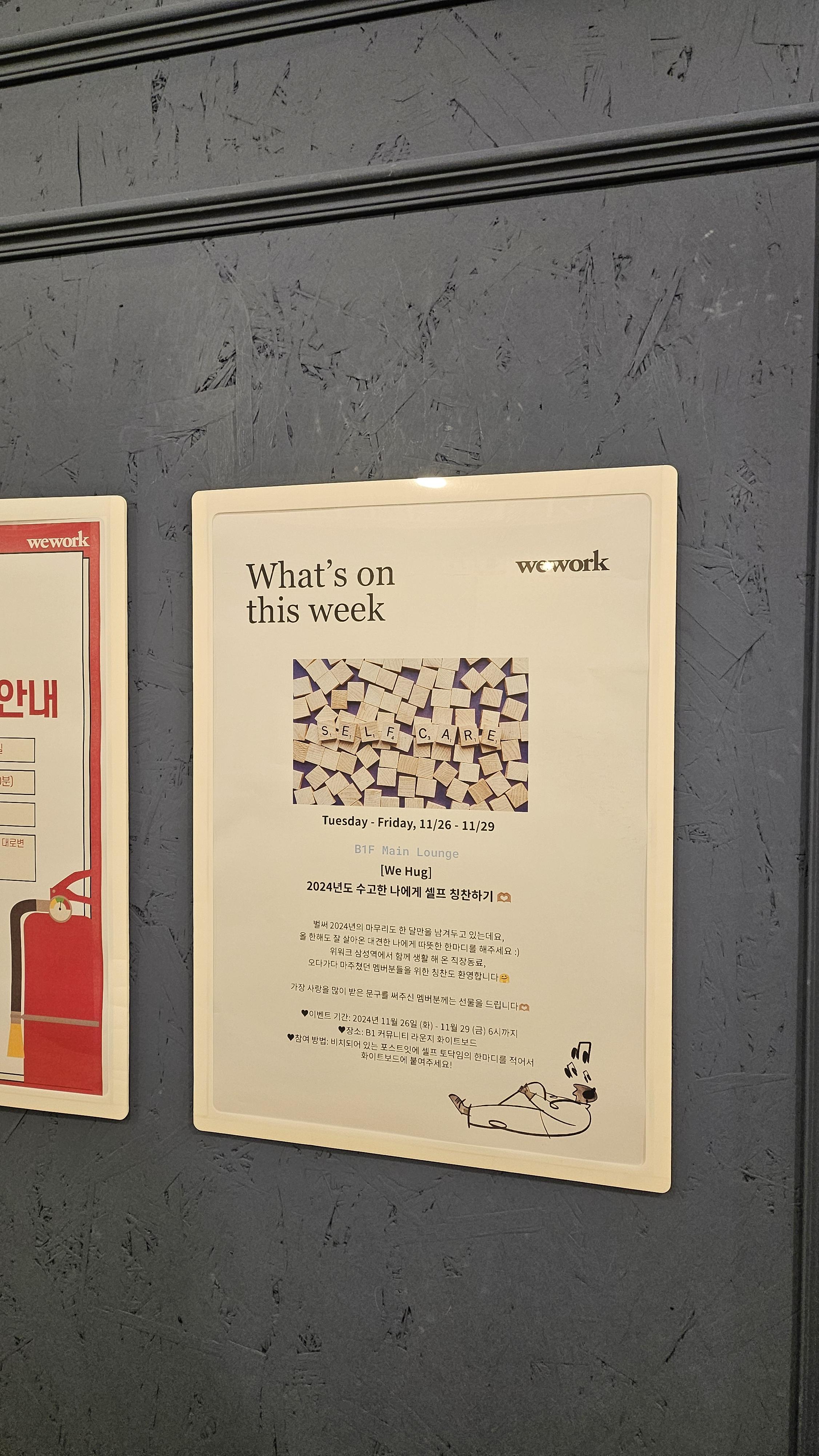 벌써 2024년의 마무리도 한 달만을 남겨두고 있는데요, 올 한해도 잘 살아온 대견한 나에게 따뜻한 한마디를 해주세요 :) 위워크 삼성역에서 함께 생활 해 온 직장동료 혹은 오다가다 마주쳤던 멤버분들을 위한 칭찬도 환영합니다🤗 가장 사랑을 많이 받은 문구를 써주신 멤버분께는 선물을 드립니다🫶🏽 ♥️이벤트 기간: 2024년 11월 26일 (화) - 11월 29 (금) 6시까지 ♥️장소: B1 커뮤니티 라운지 화이트보드 ♥️참여 방법: 비치되어 있는 포스트잇에 셀프 토닥임의 한마디를 적어서 화이트보드에 붙여주세요!